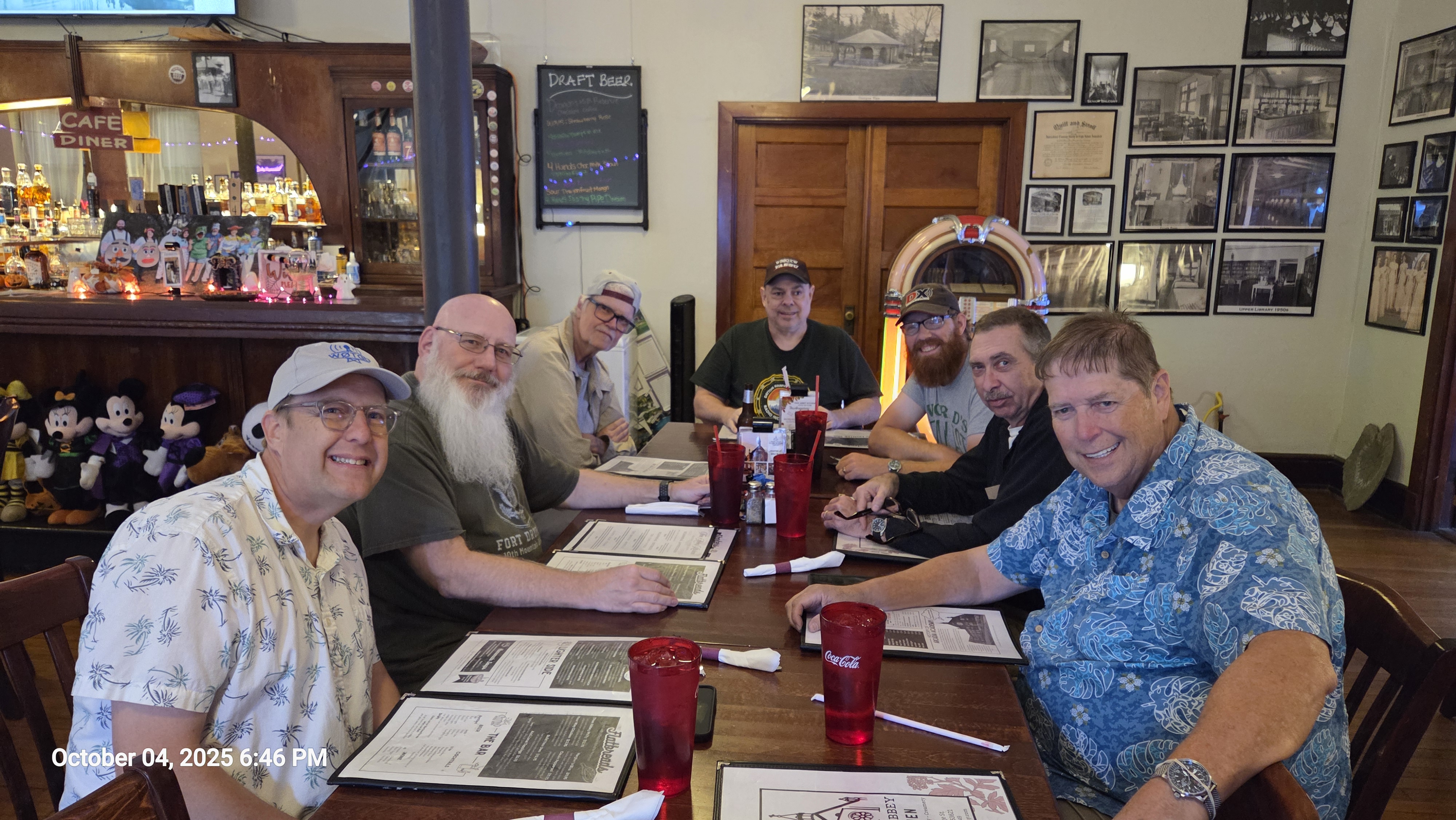 2025 RADIO EVENT DINNER. CLOCKWISE FROM TOP: BOB WBØQXW, PAUL K6STL, ANDY KFØUCB, AL WBØAL, DAVE WØTGD, JIM KE9AIQ, RICK WRTA261.