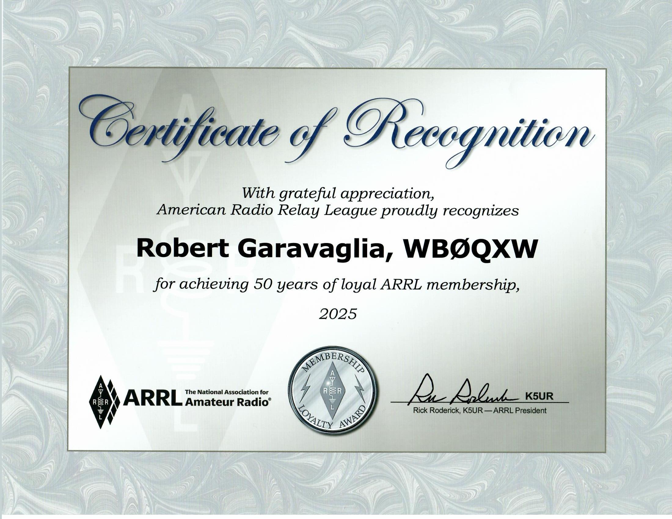 My name is Bob Garavaglia, WBØQXW, and I have been a Ham Radio Operator since 1975. Welcome to the 521 Amateur Radio Group (521 ARG) webpage. All the members of my immediate family are also Hams. They are, my brother Carl, KAØPWL; my sister Judy, NØIIY; and my brother-in-law Ron, NØIIZ. Our group also has a club call sign, KØYCV for use in group activities such as Field Day or camping trips. Our club call sign is now a vanity call sign once held by my father for over 66 years. A perfect way to have his call sign live on as a tribute to him.
