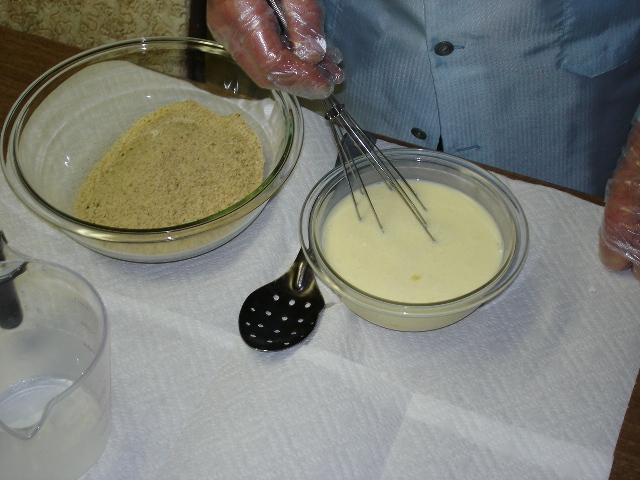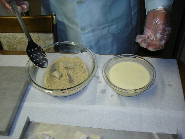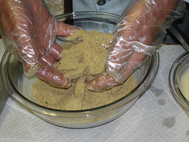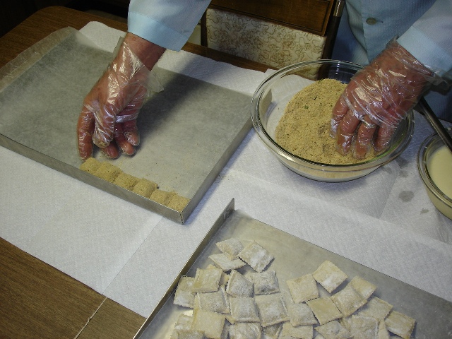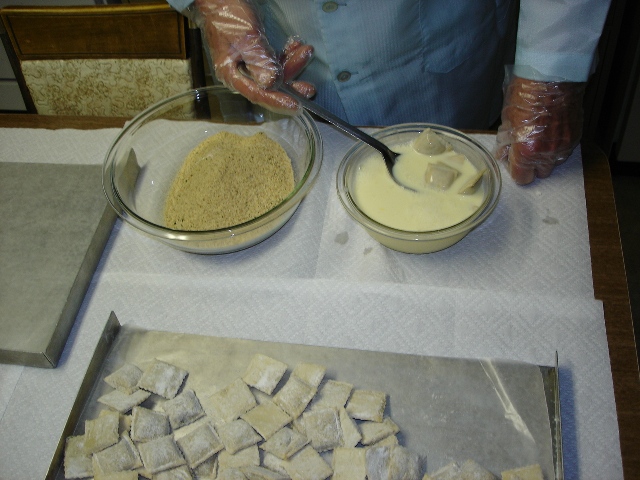 REMOVE FROM BATTER AND DROP IN BREAD CRUMBS THOROUGHLY COAT RAVIOLI WITH BREADING